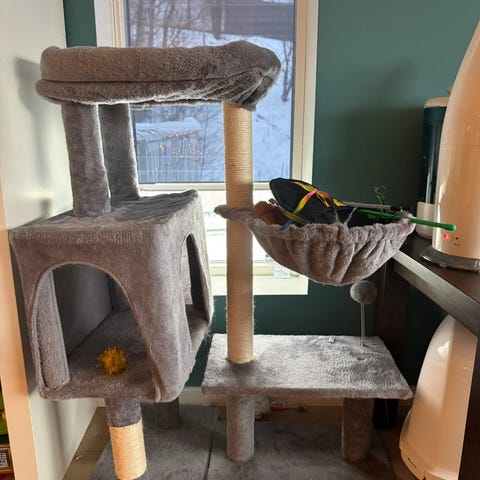 Katte hammock som monteres på vindu så katten kan slappe av og se ut. Ble flittig brukt av vår frem til jeg tror han følte seg for stor (skogskatt).