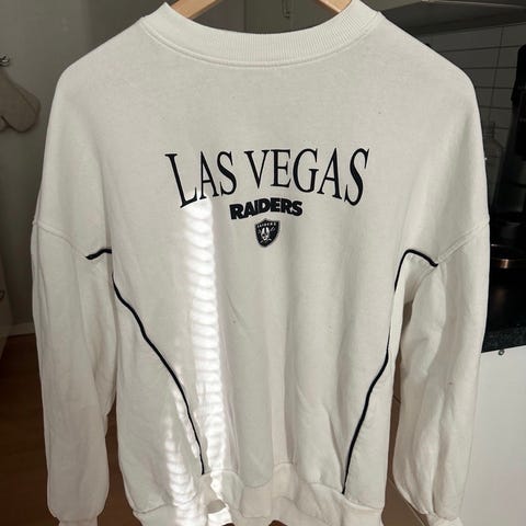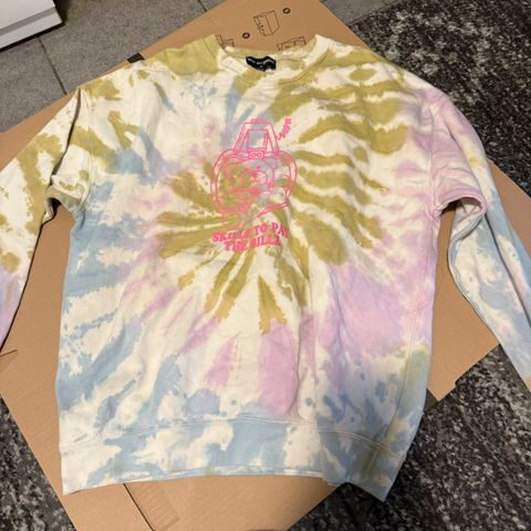Pent brukt og superfin collegegenser fra H&M, laget i samarbeid med Netflix-filmen To All the Boys Iâve Loved Before. Lys tie-dye-effekt i hvitt/blĂĽtt med brodert blomst pĂĽ brystet.
