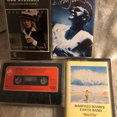 Selger 4 kassetter med god, gammel musikk fra 70 og 80 - tallet. Disse er: Genesis (1983) , The Riddle m/ Nik Kershaw, Touch Me m/ Gary Glitter (1973) og Deep in the heart of nowhere m/ Bob Geldof.