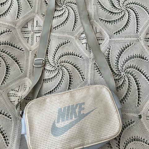 Brukt Nike crossbody / slingbag i lys farge med sort logo. Praktisk og lett sekk som kan bæres over skulder eller bryst – perfekt til hverdagsbruk, reise, festival eller trening.