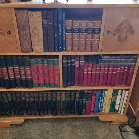 Tre bokhylle med flere hyller for oppbevaring av bøker og andre gjenstander. Passer til bruk i stue, kontor eller bibliotek. Fine detaljer.