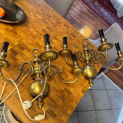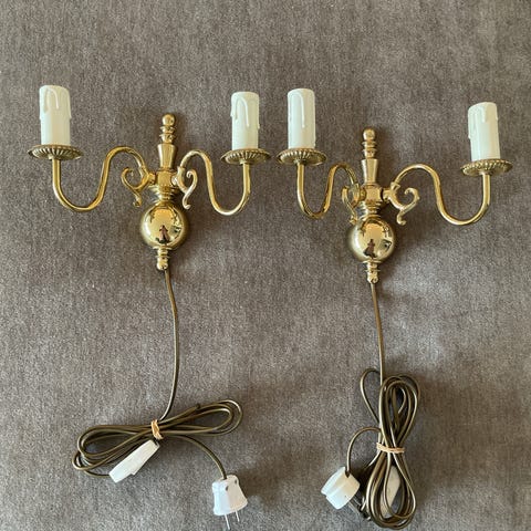 To rustikke messing lampetter ca 28 cm høye. Legg merke til at de er ulike.