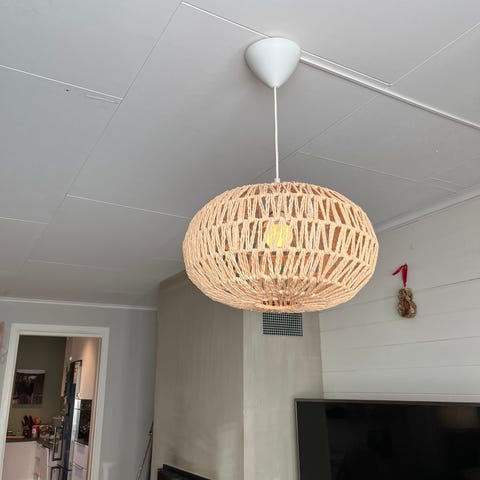 Taklampe med plass til tre pærer selges. Lys grått stoff.