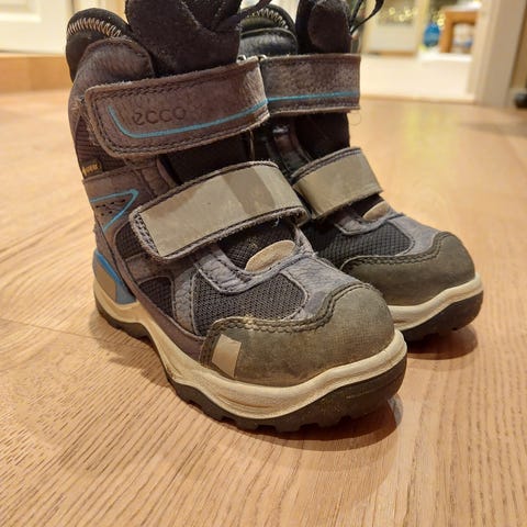 Sparsomt brukte vintersko. Kjøpt nye påske 2025 og brukt da. Ble pakket frem igjen før jul, og brukt noen ganger. Nå er de for små 🤷