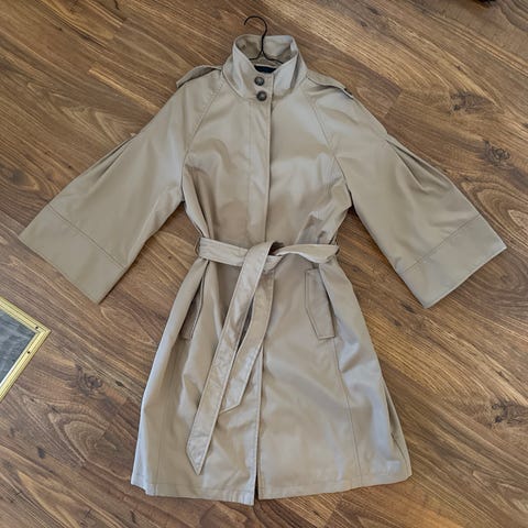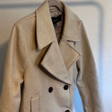 Vero Moda kåpe i beige fuskepels, størrelse M for dame. Jakken har et mykt og fluffy materiale som gir varme og komfort. Lukkes med trykknapp og hempe i livet, har lommer på begge sider.