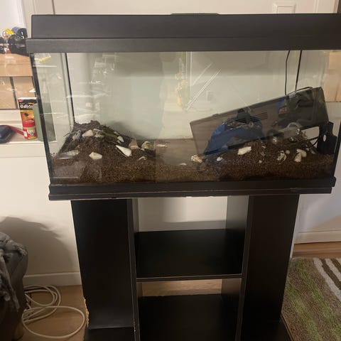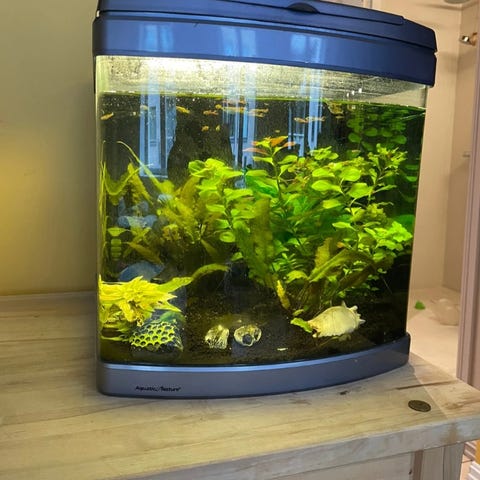 Aquael akvarium med innebygd filter og varmeelement. Akvariet inneholder dekorasjoner som en båt og undervannsfigur. Egnet for oppdrett av små til mellomstore akvariefisk. Glassmateriale med sandbunn. Passer til hjemmebruk.