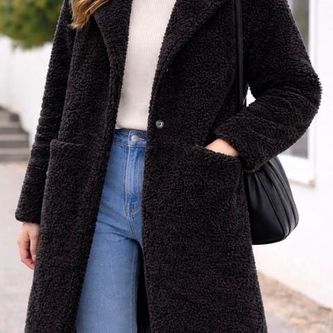 Svart lårlang kåpe i teddy/fuskepelsmateriale. Lukkes med hemper midt på, lommer på begge sidene.