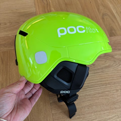 POC POCito hjelm i størrelse M-L, fargen rød. Hjelmen er designet for å gi beskyttelse og komfort ved bruk. Den har justerbar passform og er egnet for barn og ungdom.