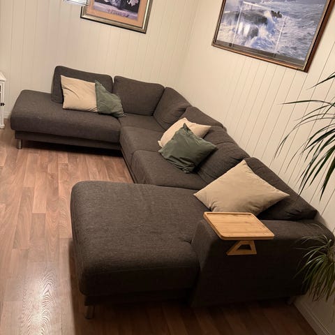 Hjørnesofa fra IKEA selges. Fargen er Gunnared blå med treføtter. En pall følger også med. Den er kjøpt i juli 2024. Har stått i hus med hund.