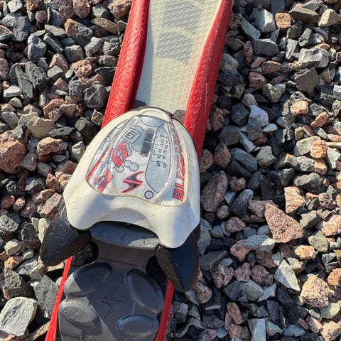Dynastar Max 6 alpinski med Rossignol bindinger. Skiene har en lengde på 170 -180 cm og er designet for allsidig bruk i fjellet. Bindingene er justerbare og passer ulike skistøvler. Skiene har en rød, hvit og svart fargekombinasjon.