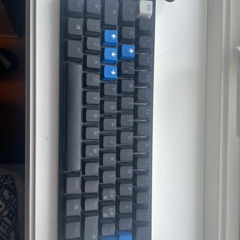 Ducky one 2 mini tastatur med hvite og blå taster. Kompakt design med 66 taster. Tilleggsutstyr for datamaskiner. Veldig pent brukt