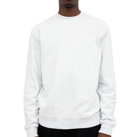 Wood Wood genser i størrelse S for herre. Genseren er grå og laget av bomull. Den har et enkelt design med rund hals og et rødt trykk på brystet.