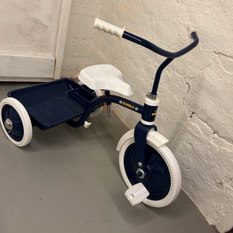 DBS barnetråsykkel med 10 tommers hjul, i blå og hvit farge. Sykkelen har tre hjul og er designet for små barn. Den er hel og fin.