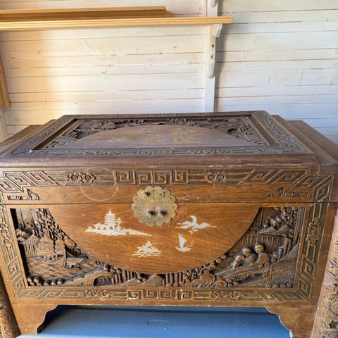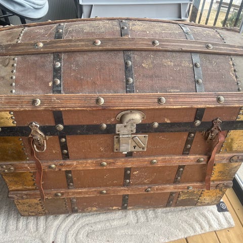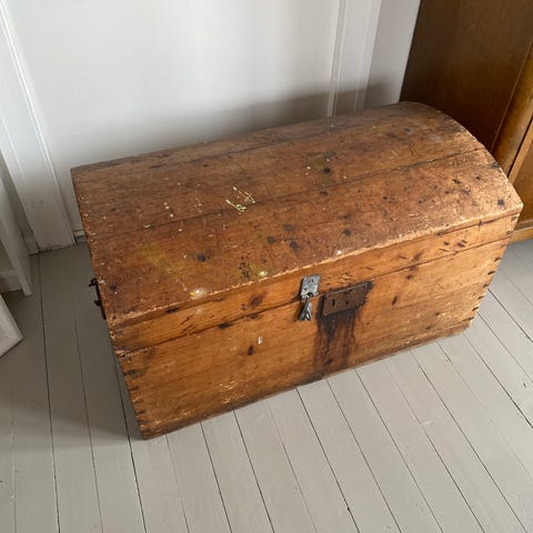 Antikk kiste i tre med buet lokk og jernbeslag