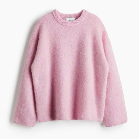 H&M Genser i mohairull, brun farge, størrelse S for dame. Genseren er laget av 38% mohair, 38% ull, 19% polyamid og 5% elastan.