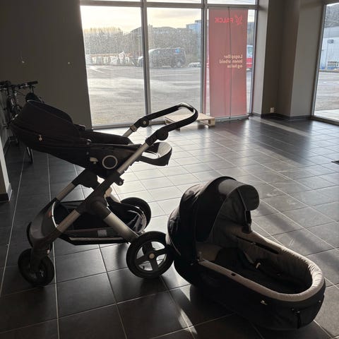 Regntrekk, myggnett og koppholder medfølger.