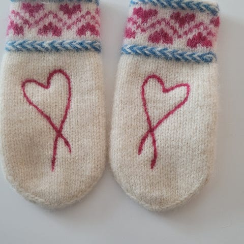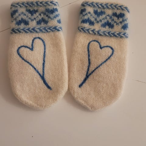 Hjemmestrikkede tovede votter. Strikket med Rauma vams og nålefiltet pynt på. Hentes I Moelv eller sendes med fiks ferdig.