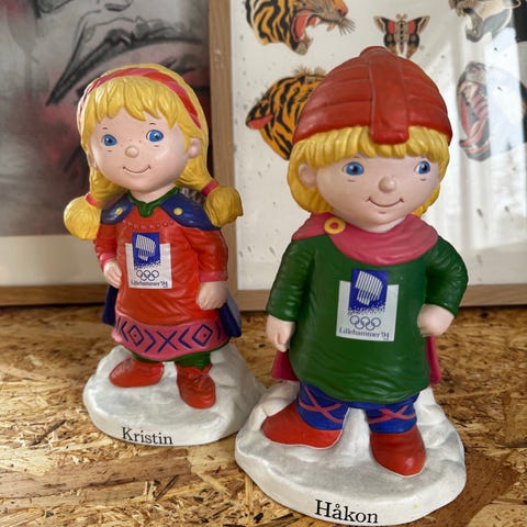 Figuren Kristin har blondt hår og er kledd i lilla og rosa, mens Håkon har rød lue og er kledd i grønn og rosa. Begge figurene står på en hvit base. Figurenes navn er merket på fronten.