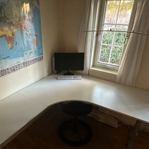 Veldig pent brukt skrivebord fra AJ produkter selges, bordplaten er 140cm lang, 80cm bred og 73cm høy, passer perfekt til hjemmekontor. Leveres ikke, må hentes av kjøper. Kan bistå med demontering om nødvendig.