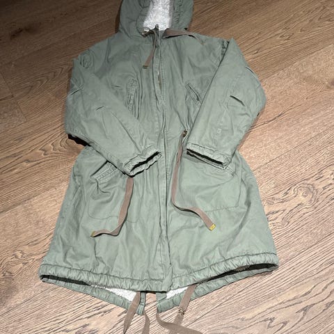 Mosegrønn vinterjakke i størrelse M. Den har hette med avtakbar fuskepels og teddy fôret innsiden som gir ekstra varme. Jakken har knapper og glidelås, samt lommer på utsiden i tillegg til brystlommer. Justeres rundt hetten, i livet og bak med snorer.