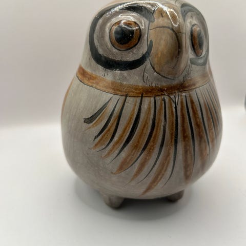 Keramikkgris i terrakotta farge med grønn og hvit dekor. Blank og fin, litt krakelering på toppen, se bilde. Det er en propp i trynet som er åpningen.