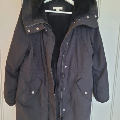 Koksgrå parkas fra Samsøe Samsøe. Godt foret, så god og varm. Lukkes med glidelås og trykknapper fremme, kan justeres i livet med snor. Foret hette og lommer på begge sider.