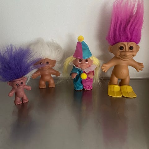 4 mindre lykketroll med ulike antrekk.