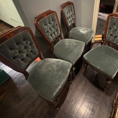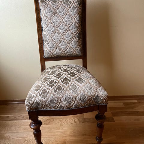 4stk antikke stoler i tre med mønstret stoff på setet. Stolen har en klassisk design med buet rygg og trespiler. Passer til bruk som spisestol eller dekorativ stol i hjemmet. Prisen er for alle