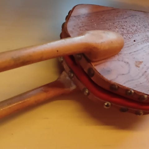 Stativ for kjel/gryte til ildsted (antikk), ca12 cm høy. Ett ben er reparert.