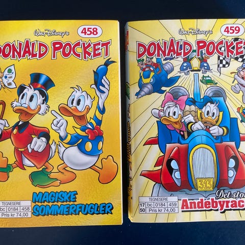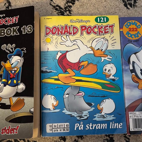 Jeg selger mine Donald Pocket tegneseriebøkene mine. Serien inkluderer flere bind med karakterer som Donald Duck, Ole, Dole og Doffen, og andre kjente figurer fra Disney-universet. Passer for samlere og lesere av tegneserier.