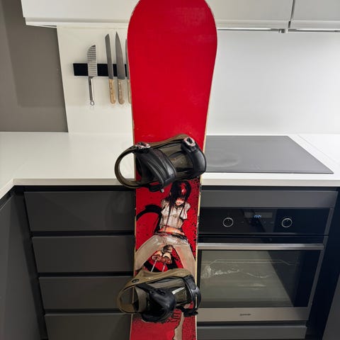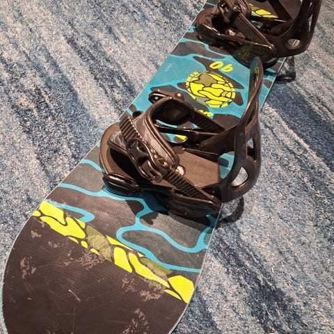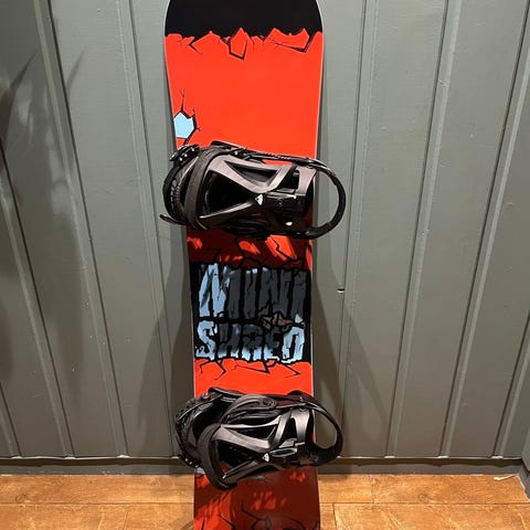 Rome SDS Minishred snowboard med lengde på 90 cm. Brettet har fargerik design i blått og gult. Inkludert bindinger og støvler i svart.