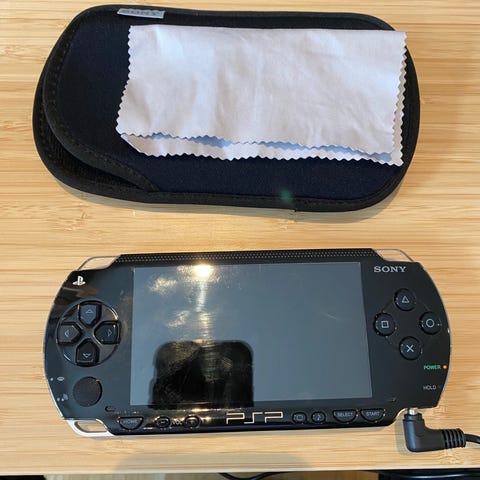 Sony PSP bærbar spillkonsoll i rosa farge. Inkluderer fire spill, én film og beskyttelsesetui fra Logitech.