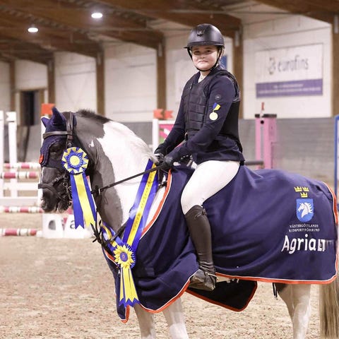 Tävlad upp till 90 cm, placering i 80 cm, väldigt fin även att rida på marken, rids på vanligt tredelat bett, pigg och framåt men med tydlig broms.