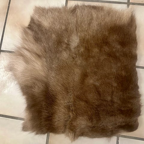 Reinskinn teppe med naturlig pels i ulike brune og hvite nyanser. Skinnet har en myk tekstur og uregelmessig form som følger dyrets naturlige konturer. Egnet for bruk som dekorativt gulvteppe eller som et mykt underlag.