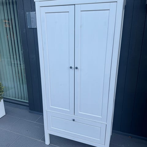 Billig skap som rommer litt klær som kan henges. Noe søl i skuffen som er løst med ileggspapir.