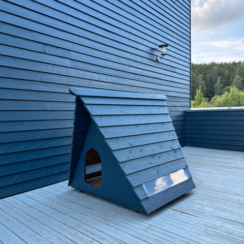 Dette er den minste størrelsen som tåler vekt opptil 20 kg. Størrelse: Tak 70 × 50 cm, høyde 47 cm, total lengde (med trapp og hule) 119 cm. Vi har brukt trappen «sideveis», da er full bredde 102 cm.