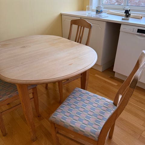 Heltre furu. Veldig solid, men treet her noe flekker. Stolene har hatt trekk, så setene er rene og uten flekker. Det følger også med to uttrekksplater på 40 cm hver. Selges samlet kr 1400,-. Ev. kun bord for kr 900,- og kr 100,- pr stol