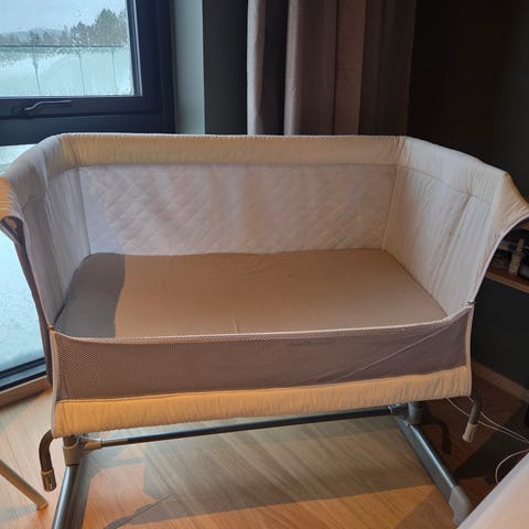 Chicco Bedside crib egnet for bruk som barneseng ved siden av foreldreseng. Designet for enkel tilgang til barnet og trygg soveplass. Materialer og farger er nøytrale og tilpasset barnemiljø.