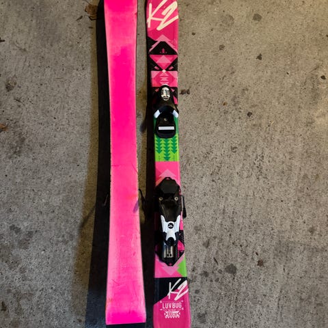 K2 Luvbug barneski med en lengde på 76 cm, i rosa farge. Medfølgende støvler i 2 ulike størrelser. Skiene selges for 800. Slalomstøvler selges for 250 pr par. Kan selges separat. Uten staver.