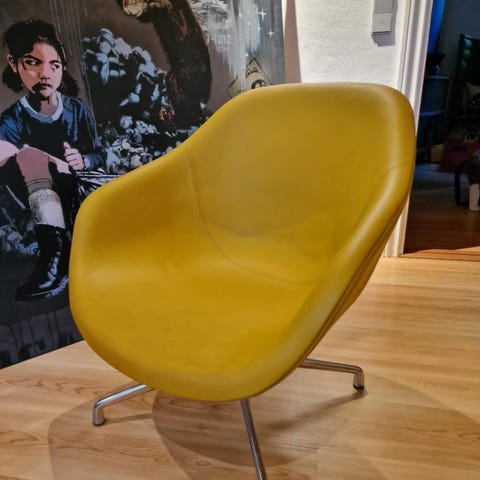 Pent brukt stol fra Vitra i fargen mustard. Utrolig god sittekomfort, og lett å flytte rundt på.
