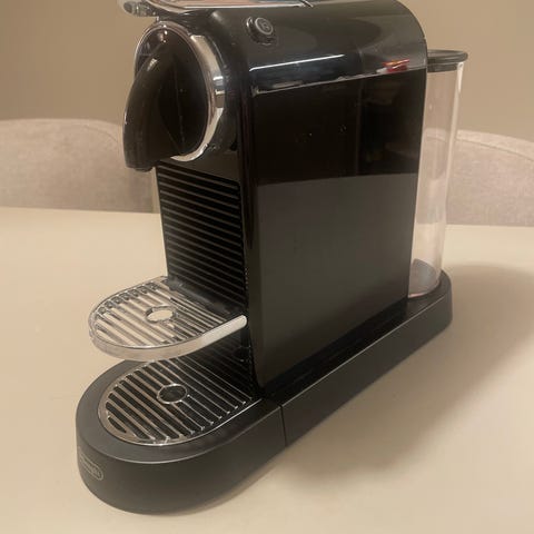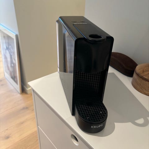 Nespresso kapselkaffemaskin i svart farge. Kompakt design for enkel bruk og plassbesparelse. Egnet for brygging av espresso og andre kaffedrikker med Nespresso-kapsler.