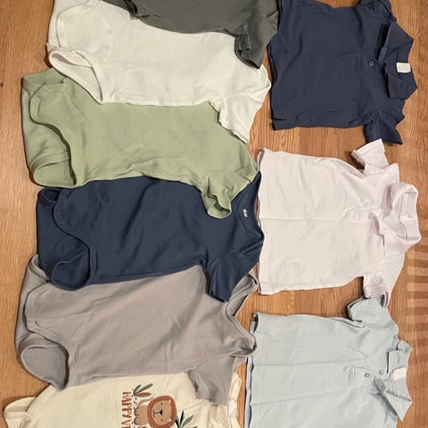 Sommerklær for gutt i størrelse 86 med flerfarget design. Inneholder ulike plagg som pysj m kort arm/ben, bodyer, shorts og sett med forskjellige mønstre og farger. Fra H&M, Lindex og Newbie,. Noen plagg har flekker, men har ikke prøvd å vaske bort dette med spesial såpe.