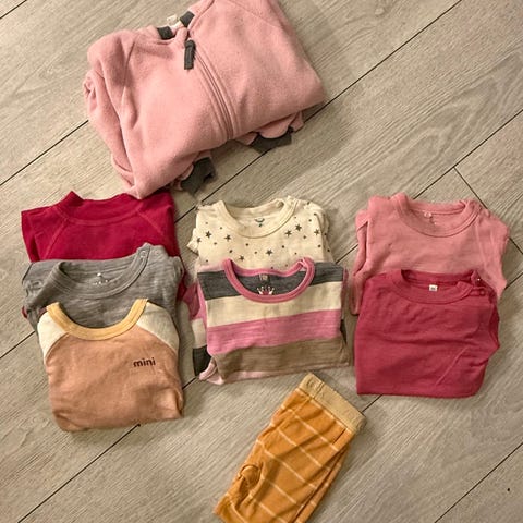 Pent brukt ull fra blant annet Hust&Claire, nameit reflex, joha. Flere sett. Buksene har noen bruksmerker på knærne, og den lilla buksen har hull på et kne. Ellers er klærne i meget pen stand.