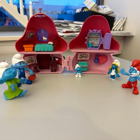 Smurfene lekesett med blått hus som kan åpnes, inkludert tre små figurer av smurfer. Huset har detaljer som dør, vindu og pipe, og er laget i plastmateriale. Passer til lek og samling.