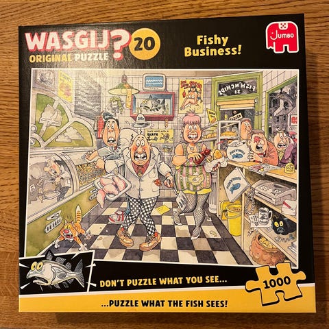 Jumbo Wasgij? 28 Feline Frenzy puslespill med motiv som involverer katter og mennesker i en livlig kafé. Puslespillet utfordrer brukeren til å legge bildet av hva som skjer neste, ikke det som vises på esken.