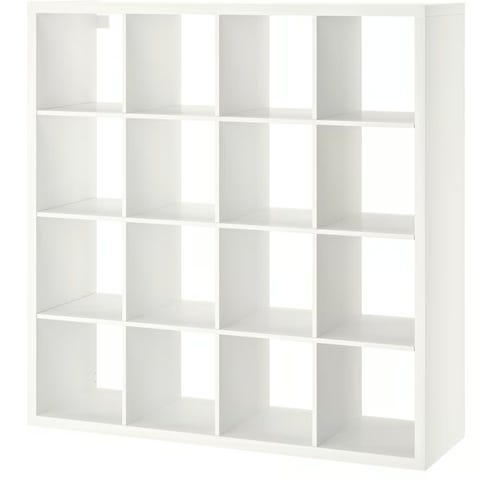 IKEA Kallax oppbevaringshylle i hvit utførelse med flere rom for oppbevaring. Hylleenheten har et enkelt og funksjonelt design som kan brukes til oppbevaring av bøker, dekorasjoner og andre gjenstander. Passer for ulike rom i hjemmet eller kontoret.