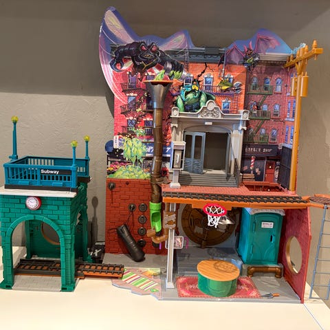 Ninja Turtles lekesett med flere nivåer og detaljer som inkluderer stiger og en heis. Passer for barn som er interessert i Ninja Turtles-universet. Den kommer helt ny innpakket i original eske, aldri brukt. Men det mangler et lite grønt hus som skal stå ved siden av.