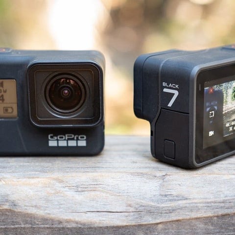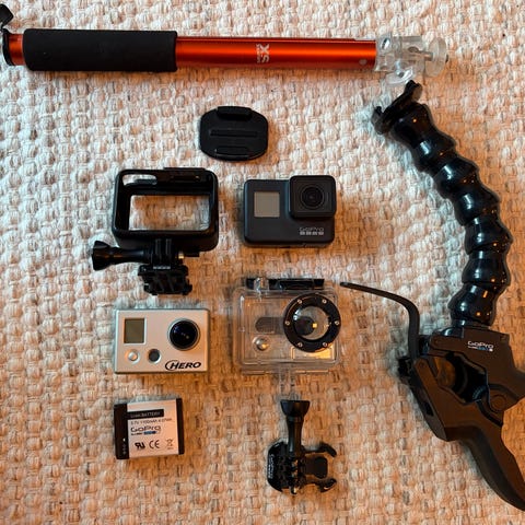 GoPro Hero 7 Silver actionkamera med tilbehør for montering. Kameraet har en kompakt design og er egnet for opptak av video og bilder i ulike situasjoner.