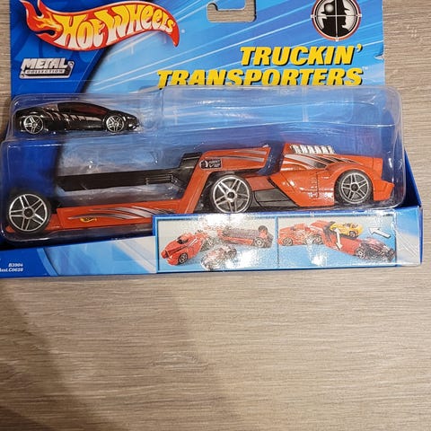 Hot Wheels bilsett bestående av en lastebil med tilhenger og en bil. Settet er laget i plast og metall,