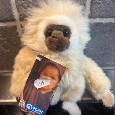 Bamse Brain Rot kosedyr i form av en grønn ape med rosa ansikt og en banan som . Laget av mykt materiale egnet for små barn.